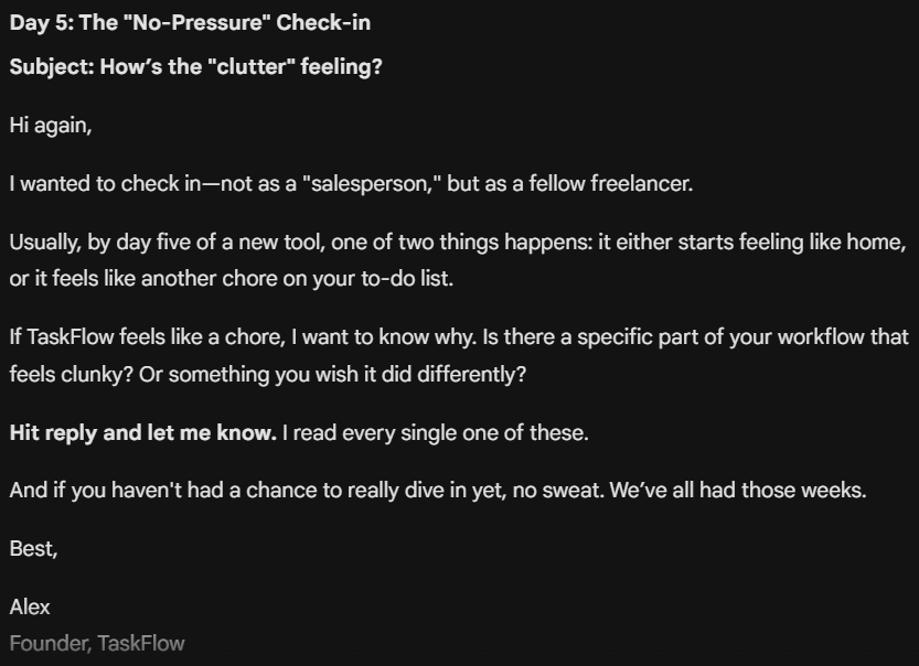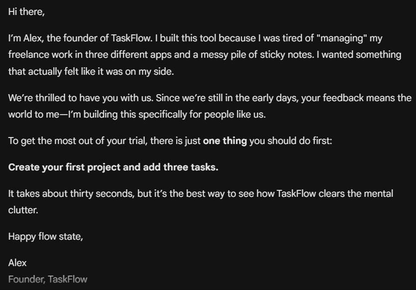A SaaS product called TaskFlow, a project management tool for freelancers, and a new user who just signed up for a free trial.